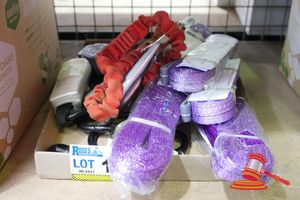 BOX OF ASSORTED TIE DOWN STRAPS, ROPE, CABLE, OCKY STRAPS
