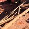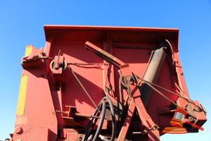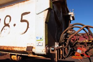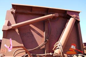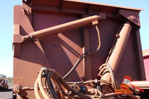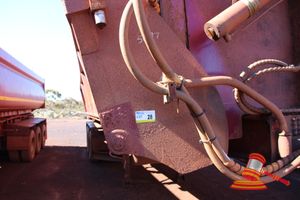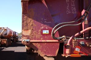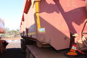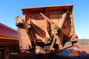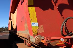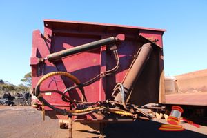APPROX 4m, A-FRAME, HEAVY DUTY OFF ROAD PIN, TRIAXLE, SPRING SUSPENSION, DRUM BRAKES, SCRAPER BALDES, ROPE DOOR, NO RING FEEDER, MISSING WHEELS ON FRONT AXLE, AXLE CHAINED UP - DAMAGED AS APPEARS TO HAVE BEEN ON ITS SIDE