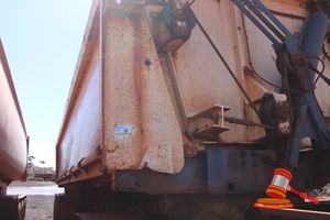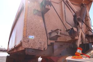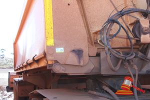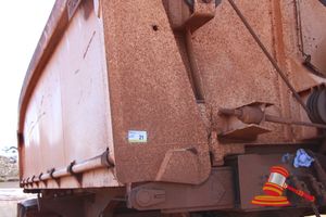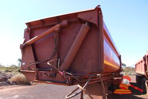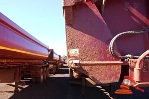 TRIAXLE, SPRING SUSPENSION, DISC BRAKES, 10 STUD WHEELS, A-SECTION, MISSING FRONT & REAR HYDRAULIC RAMS, TRAILER MISSING FRONT & REAR HYDRAULIC RAMS, RUST EVIDENT, TIPPER BODY CRACKED & TORN