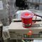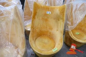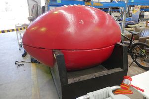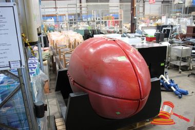 AFL FOOTBALL ON MOBILE STAND (RED). HARD FOAM SHELL WITH 1/2 LIFTABLE LID AND INSIDE RECESSED COMPARTMENT. FOOTBALL SIZE APPROX L2100 x H1150 x 1150, 1 x DEEP SCRAPE/CUT TO OUTER SHELL