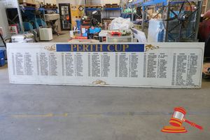 SIGNBOARD TITLED “PERTH CUP” DEPICTING THE NAMES OF WINNING HORSE/OWNER/JOCKEY/YEAR FROM 1887 TO 2002. LAMINATED CHIPBOARD, SLIGHT DAMAGE