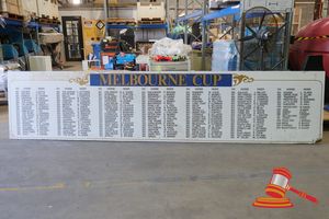 SIGNBOARD TITLED “MELBOURNE CUP” DEPICTING THE NAMES OF WINNING HORSE/OWNER/JOCKEY/YEAR FROM 1861 TO 2002. LAMINATED CHIPBOARD, SLIGHT DAMAGE