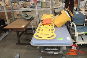 BAXSTRAP SPINE BOARD (YELLOW) AND STRAPS, PATIENT TROLLEY/GURNEY (USED CONDITION/RUST), GENERAL PURPOSE SPILL RESPONSE BAG