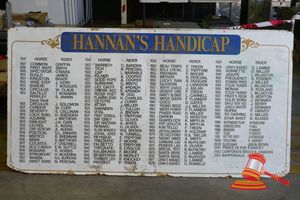 SIGNBOARD TITLED “HANNANS HANDICAP” DEPICTING THE NAMES OF WINNING HORSE/OWNER/JOCKEY/YEAR FROM 1897 TO 2003. LAMINATED CHIPBOARD, SLIGHT DAMAGE