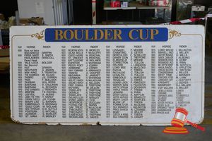 SIGNBOARD TITLED “BOULDER CUP” DEPICTING THE NAMES OF WINNING HORSE/OWNER/JOCKEY/YEAR FROM 1898 TO 2003. LAMINATED CHIPBOARD, SLIGHT DAMAGE