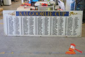 SIGNBOARD TITLED “KALGOORLIE CUP” DEPICTING THE NAMES OF WINNING HORSE/OWNER/JOCKEY/YEAR FROM 1897 TO 2003. LAMINATED CHIPBOARD, SLIGHT DAMAGE