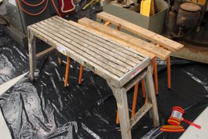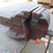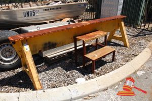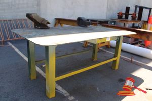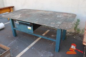 HEAVY DUTY WELDED STEEL WORKBENCH, 8 - 10mm STEEL PLATE TOP; APPROX: 2205mm x 1205mm x 850mm; 1 x DRAWER; INCLUDES: 1 x BENCH MOUNTED DAWN 150 OFFSET VICE;AND 1 x BENCH MOUNTED 150 VICE