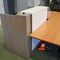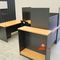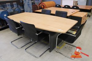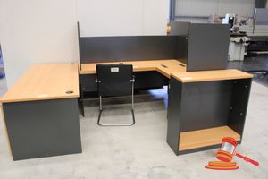 OFFICE FURNITURE BUNDLE CONSISTING OF: 1 x TIMBER LAMINATE DESK, APPROX: 2400mm x 1000mm x 720mm; 1 x TIMBER LAMINATE DESK, APPROX: 1200mm x 750mm x 720mm; 1 x TIMBER LAMINATE RECEPTION DESK; APPROX: 1200mm x 780mm x 750mm (REAR HUTCH 1125mm H); 2 x BLACK FABRIC VISITOR CHAIRS; AND 3 x BLUE/GREY FABRIC VISITOR CHAIRS.
