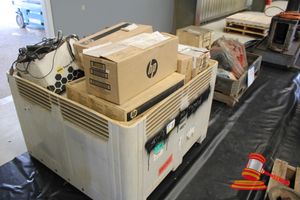 BUNDLE CONSISTING OF: 1 x METAL SERVER CABINET, ON CASTORS, APPROX: 1060mm x 750mm x 2000mm; 1 x BROTHER MFC 9970CDW, ELECTRIC, 240B PLUG, UNTESTED; AND QUANTITY OF VARIOUS HP PRINTER CARTRIDGES.