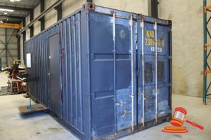 CUSTOMISED 20FT SHIPPING CONTAINER, TIMBER FLOOR; END DOOR; SIDE DOOR ENTRANCE; FABRICATED 4 TIER SHELVING; HOOKS TO WALLS; LIGHTING, 240V PLUG; FABRICATED PLATFORM AND ROLLER RACK TO SIDE; FORK POCKETS.