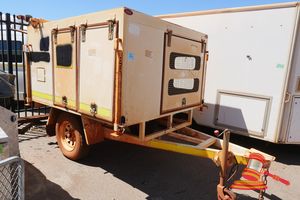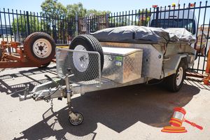 GALV, SINGLE AXLE, UNLICENSED, VIN# 6T9T27WA1E0A0S079, SPARE TYRE, 7 PIN RECTANGLE TRAILER PLUG, JOCKEY WHEEL, 50MM BALL, FRONT STORAGE BOX - CONTAINS GREEN EYELET POSSIBLE GROUND COVER- ADDITIONAL NOT FOLDED TENT SCREEN, 1x TOASTER, POLES, SIDE LPG HOLDING FRAME x2, INSTRUCTION BOOKLET, REAR COMPARTMENT FOLD OUT SINK, OZTRAIL 5 SHELF CUPBOARD, BOX OF ADDITIONAL UTENSILS ETC. (WP#4319)