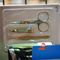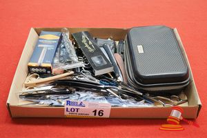 TRAY OF ASSORTED ITEMS INCLUDING 4 X INFINITY LED TORCHES, 2 X UV WATERPROOF TAPE, SHATE BOARD TOOL, PRECISION TOOL KIT, CHEESE KNIFE SETS, FRISKAS PRUNER, 2 X SLING SHOTS AND SUNDRY ITEMS