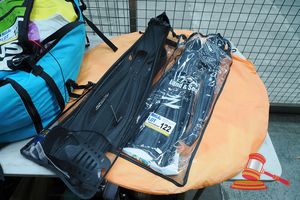 2 X LAND & SEA FLIPPERS (SIZES L & XS), CRANE POP UP BEACH SHELTER. ORANGE/WHITE