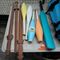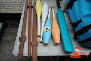 4 X PLASTIC JUGGLING CLUBS, PLASTIC CRICKET BAT, 3 X JARRAH HAND CARVED SWORDS