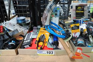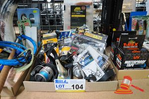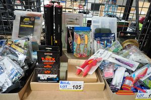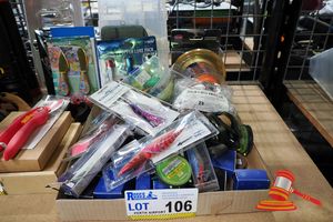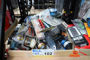 TRAY OF ASSORTED FISHING EQUIPMENT INCLUDING REELS, LURES,FISHING LINE