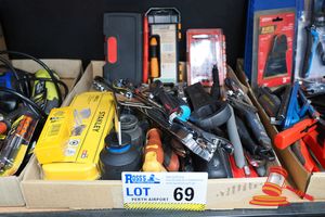 TRAY OF ASSORTED ITEMS INCLUDING 4 X INFINITY LED TORCHES, CARVED HORN, WHIP, HEAT BAG, HERB SNIPS, PRECISION TOOL SET AND SUNDRY ITEMS