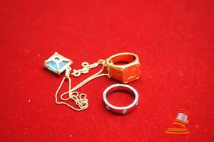 1 X MARKED CARTIER 750 "LOVE" WHITE METAL RING (52833A) , YELLOW METAL FINE NECKLACE MARKED 750 WITH APPROX 10MM X 10MM SQUARE STONE, 1 X YELLOW METAL RING MARKED LOUIS VUITON (D 1062 M80190)