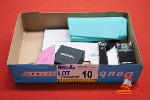 ASSORTED ITEMS INCLUDING SUNGLASSES MARKED TIFFANY & CO WITH CASE, 1 X MARKED CHANEL YELLOW METAL EAR RINGS IN BLACK PRESENTATION BOX, 1 X MARKED CHANEL CHANCE EAU DE PARFUME 1.5ML, 1 X MARKED CHANEL ULTRA LE TEINT FOUNDATION 1 X, MARKED CHANEL No1 REVIT