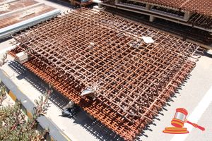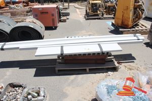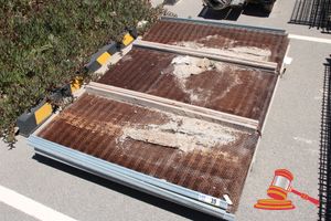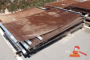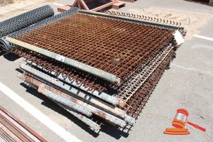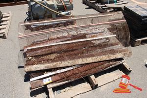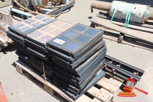 Pallet containing: 2 x Heavy Duty Steel Grates, Approx: 850mm x 830mm x 180mm; with 16 x Extruded Aluminium Slats, Approx: 3000mm x 65mm x 15mm; and 8 x Extruded Aluminium Slats, Approx: 1500mm x 65mm x 15mm.