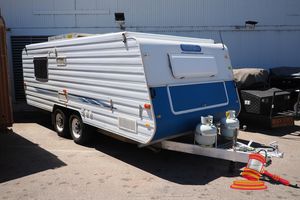 Features: Water Tank, Deep Cycle Battery, Annex Connects To Main Body, Soft Floor, Pull Out Frame, Chemical Porta Pot, Off Road Capability, Anderson Plug Connection, Spare Tyre, Small LPG Cylinder - 1984, Battery Box, 2 x Adventuridge Fans, 1 x Rear Access Door - Lock Cannot Be Opened.