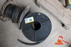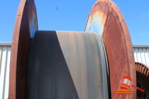 ROLL OF CONVEYOR RUBBER ON STEEL WHEEL, RUBBER DIMENSIONS 230mm x 20mm x UNKNOWN LENGTH, OVERALL DIMENSIONS 3000 x 3000 x 1440, TOTAL WEIGHT APPROX 4.5 TONNE