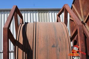 ROLL OF CONVEYOR RUBBER ON STEEL WHEEL, RUBBER DIMENSIONS 1440mm x 20mm x UNKNOWN LENGTH, OVERALL 4000 x 14600W (FRAME CAN BE DISMANTLED) TOTAL WEIGHT APPROX 4.5 TONNE